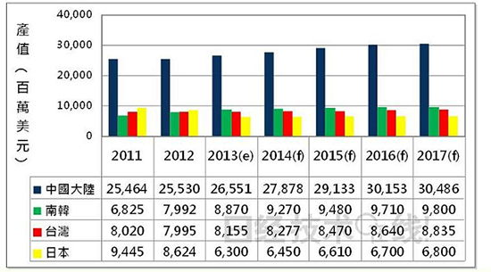在下游電子終端產(chǎn)品制造基地群聚下,中國大陸毫無疑問持續(xù)為全球第一大生產(chǎn)區(qū)域,2013年市占率達44.4%,估計2017年將成長至45.6%;而南韓以品牌帶動PCB產(chǎn)業(yè)成長效應,加上南韓生產(chǎn)線以本土布局為主,因此2013年南韓區(qū)域市占達14.8%;正式超越臺灣區(qū)域的13.6%,成為全球排名第二大生產(chǎn)區(qū)域。臺商兩岸的生產(chǎn)比重,因中國大陸西部產(chǎn)能開出,壓縮臺灣區(qū)域的生產(chǎn)比重,但臺灣區(qū)域產(chǎn)值仍將維持約2%幅度的逐年成長。