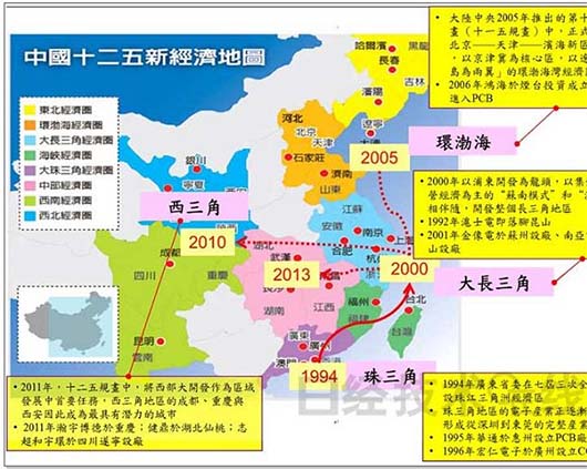 跟隨著中國大陸開發(fā)腳步與政策推動,PCB產(chǎn)業(yè)依循同樣腳步進行布局,包括1994年的珠三角開發(fā)區(qū)、2000年長三角開發(fā)區(qū)、2005年環(huán)渤海開發(fā)區(qū)以及2010年中央開始推動大西部開發(fā)的西三角開發(fā)區(qū);而臺從1994年華通于惠州設立PCB廠開始,臺灣PCB廠商于中國大陸也跟循大開發(fā)政策進行布局,目前主要集中在華南、華東,而從2010年開始也有臺商開始進駐重慶、成都等西部城市。