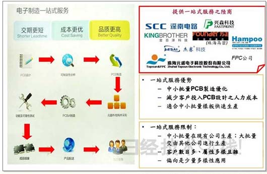 由于消費電子產(chǎn)品的多樣化、生命周期愈來愈短,造成產(chǎn)品邁向量少、高客制化,也因此大陸PCB廠皆積極投入此領域,進行利基型競爭;一站式服務優(yōu)點有以下:包括可以進行中小批量PCB制造優(yōu)化、減少客戶投入PCB設計之人力成本、適合中心批量樣板快速生產(chǎn);然而也有其限制,包括中小批量在現(xiàn)有公司生產(chǎn),然大批量在缺乏產(chǎn)能支持下,比須轉(zhuǎn)由其它公司生產(chǎn),造成產(chǎn)線轉(zhuǎn)換之成本;一站式服務處理之客戶數(shù)目多、屬性多樣且雜,造成PCB廠商在管理上之難度,而應用也是鎖定少量多樣性應用;包括深南電路、興森快捷、杰賽科技、珠海方正、珠海元盛電子等,都已積極布局一站式快板服務。