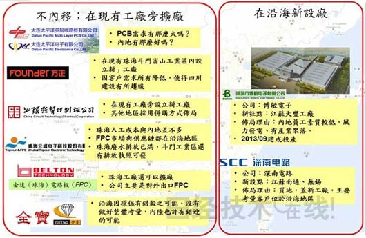 目前內(nèi)陸地區(qū)雖然工資與沿海地區(qū)有一段差距,但在人員素質(zhì)部分仍待加強,也因此產(chǎn)生管理上的困難,例如在沿海工廠某一段生產(chǎn)線需要10個人力完成、但內(nèi)陸工廠同樣一段生產(chǎn)線則是需要15個人力完成,雖然人平均工資較低,但總體加總起來人力成本并不會比較節(jié)??;另一個陸商不往內(nèi)陸布局的重點,在于客戶關(guān)系;陸資廠客戶主要都集中在陸資本土中小型電子廠,而這些電子廠大多設于華南與華東,并無內(nèi)移需求,也因此陸資PCB廠并無太大誘因往內(nèi)陸移動。而若當真正要移動時,大多采用并購方式來達成,例如珠海方正于重慶的廠房即是透過并購方式進行布局、也包括廣東生益集團亦是如此,而非如其它廠商一般在內(nèi)陸重新建立新的生產(chǎn)線。