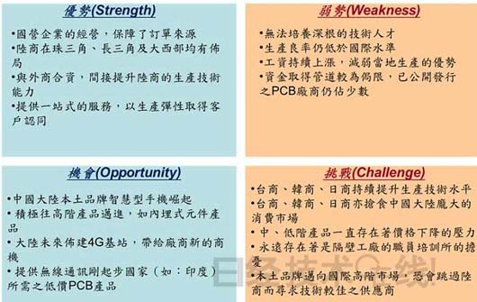 中國大陸雖然已經(jīng)成為全球最大電子零組件生產(chǎn)基地,然而在技術(shù)與產(chǎn)品布局部分,中國大陸本土陸資廠與全球主要領導大廠仍有一段距離;然而也由于長期在中小型、本土品牌市場耕耘,也因此取得較為利基型市場,不用參與全球電子零組件產(chǎn)業(yè)高度競爭。透過SWOT構(gòu)面,針對中國大陸本土陸資電子零組件產(chǎn)業(yè)進行分析與總整。